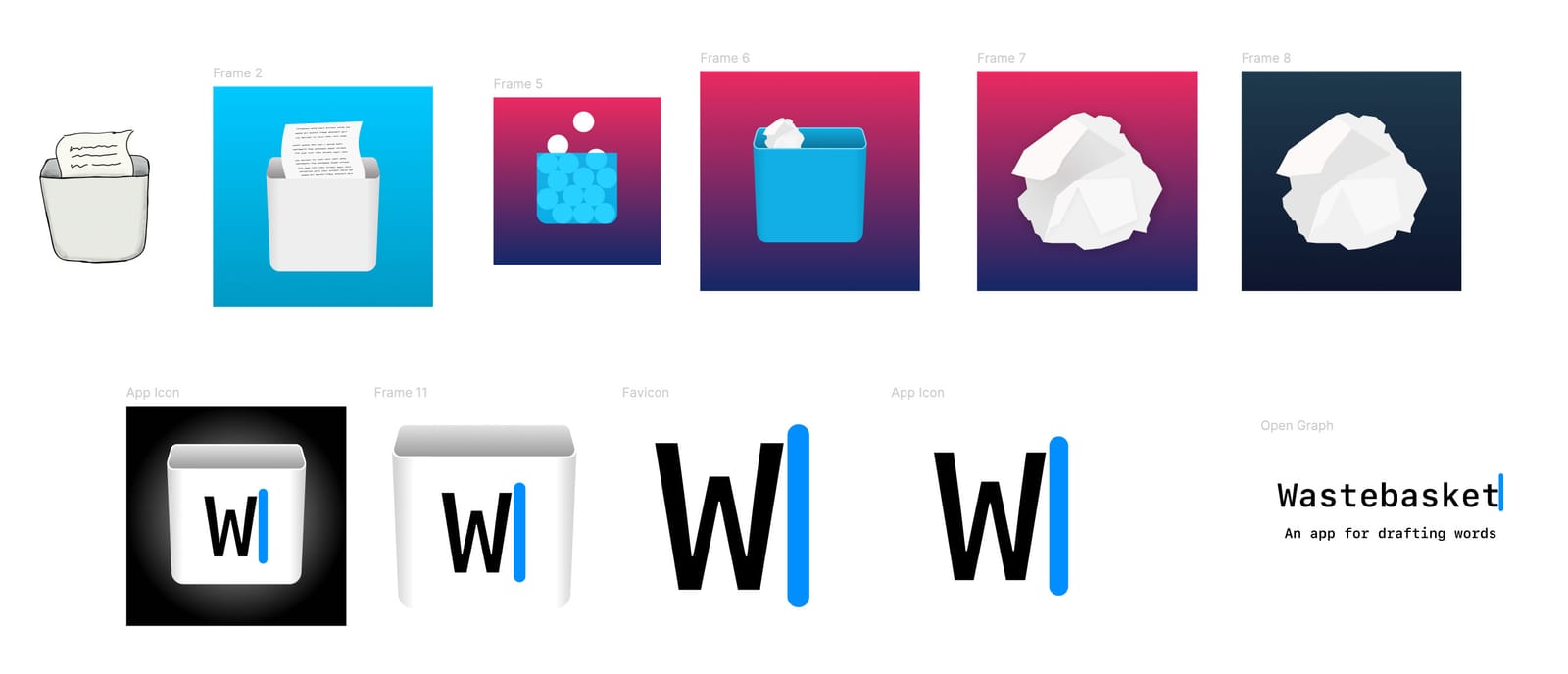 Coming up with a name for a writing app is hard. There are millions of them and they already make use of any word that has anything to do with writing. I was inspired by the old typewriter trope of crumpled-up false starts tossed in the bin. Wastebasket.com, like any word in English, was already taken but .app was not! I spent some time trying to come up with a more or less literal take on the name for an icon but they were all unreadable at small sizes. So I ended up going with the only important part of the UI—a letter and the caret.